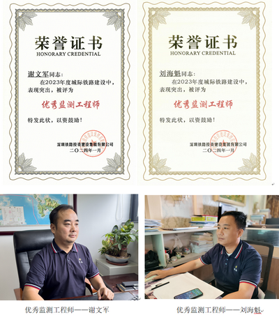 在2023年度深圳城际铁路项目建设中,深勘集团谢文军、刘海魁两人获得表彰,被评为“优秀监测工程师”。