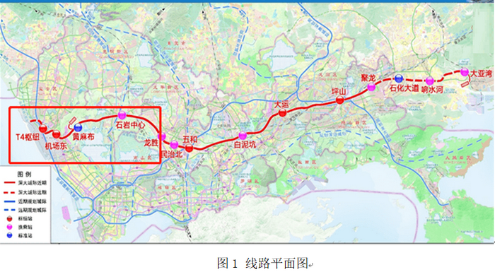 深大城际铁路深圳段位于深圳市北部,承担深圳向东辐射惠州、向西跨珠江辐射中山功能。在深圳市内承担城市东西向快速联系功能,兼顾东部地区机场快线功能。深圳机场至大亚湾城际深圳机场至坪山段起自深圳市宝安机场,途径深圳市宝安、龙华、龙岗、坪山区四个区,止于聚龙站。线路全长 69.192km,设T4枢纽、机场东、黄麻布、石岩中心、龙胜、 民治北、五和、白泥坑、大运、坪山、聚龙 11 座车站,均为地下线和地下站。